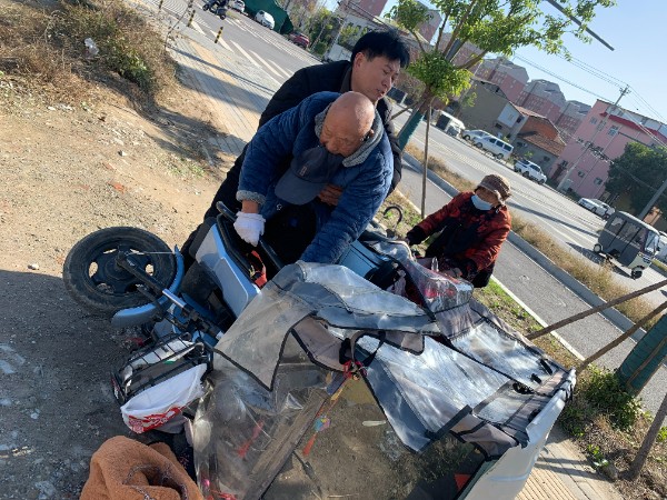 当日11时30分许,满心欢喜奔赴儿子定亲宴的张永军,行至途中时突然发现前方道路上出现险情:一对老人驾驶的电动车不慎侧翻,车轮仍在空转,现场情况危急。张永军来不及多想,立即与同行人员紧急停车,快步上前查看情况。