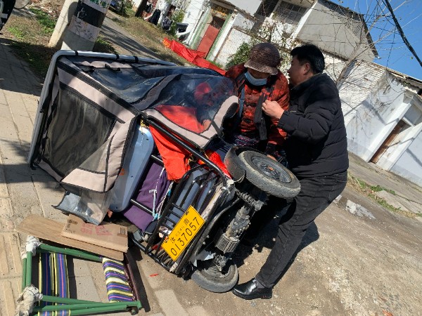 他首先小心翼翼地俯身将年迈的老大娘从车内轻轻抱起,稳稳地安置在路边安全区域,全程动作轻柔,生怕碰伤老人。随后,他半跪在地,一手托住残障大叔的腰背,一手紧紧扶住其手臂,耐心且费力地将老人从狭小的驾驶空间中缓缓搀扶出来。待两位老人在路旁座椅坐稳后,张永军又与同行伙伴合力将侧翻的电动车扶起,仔细检查车辆状况,确认无安全隐患后,才放心地将老人搀扶上车,并反复叮嘱“慢点开,注意观察路况”。