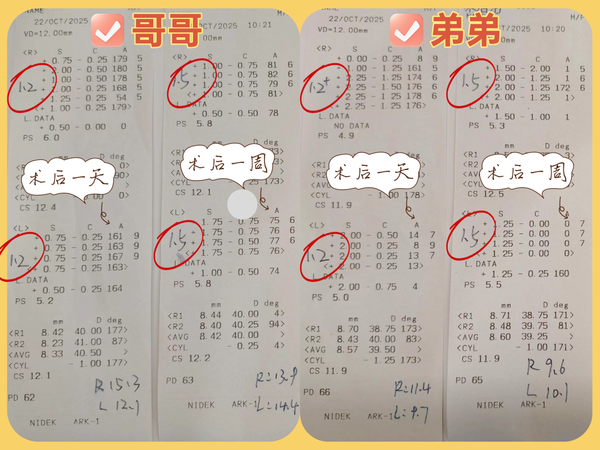 经过30余项全面高标准的近视手术术前检查,河南大学附属爱尔眼科医院副院长、屈光近视手术专科主任游昌涛为兄弟俩量眼定制了#爱尔微创全飞秒精准4.0手术方案。手术当天,兄弟俩互相鼓励,先后走进手术室,经过整个严格的手术规范流程,手术顺利完成。当术后第一周验光,看到视力表上1.5的视标清晰可见时,兄弟俩难掩激动:“真的没想到,不用戴眼镜也能看得这么清楚,早知道就早点来了!”