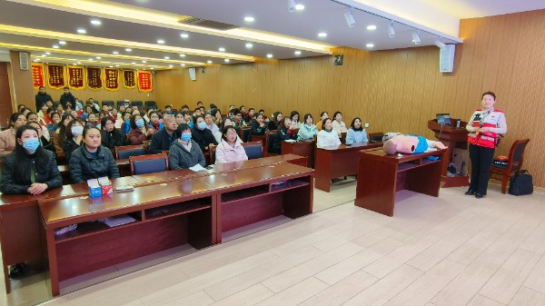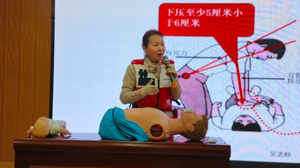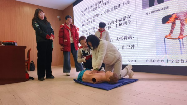 健康体检结束后,应急救护培训随即启动。驻马店市红十字会高级讲师吴春华凭借丰富的教学经验和专业的救护知识,以通俗易懂的语言、生动鲜活的案例,围绕成人与儿童心肺复苏(CPR)、海姆立克急救法、自动体外除颤器(AED)的使用等核心内容展开讲解。针对不同年龄段人群心肺复苏操作的差异,吴春华详细拆解了判断意识、呼叫求救、胸外按压、开放气道、人工呼吸等关键步骤,强调了按压深度、频率、手势等细节要点。