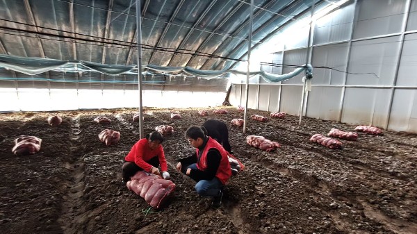 种植技术指导环节,科技特派员从基料管理、温湿度调控、病虫害防控三方面进行细致讲解。一是营养袋需按“小麦粒48%,玉米芯30%,棉籽壳20%,生石灰2%”配比,播种一到两周后,当菌丝长出土面,放置营养袋。在营养袋一面划V型口,开口的一面平放在菌床表面压实。二是保持棚内温度在18-22℃,空气相对湿度在65%-75%。15-20天后,菌丝开始萌发,此时要注意观察菌丝生长情况,如有杂菌污染,及时采取措施清除。三是严格做好场地和工具的消毒工作,使用石灰、漂白粉等进行消毒。发现病虫害时,及时采用生物防治或低毒低残留的农药进行防治。