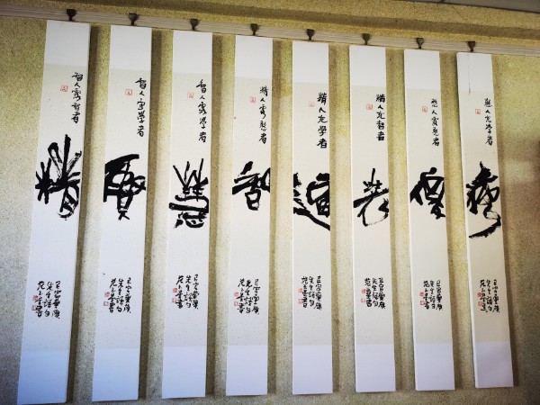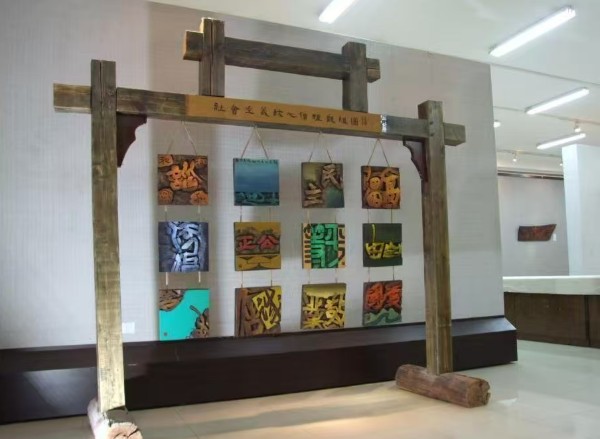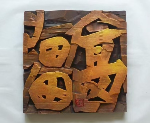 刻字展区内,曾入选《学习强国》并在新乡市区展馆、高校巡展十余场的《社会主义核心价值观组图》尤为吸睛。这套历时百余天与女儿范振彦共同创作的作品,以 “传统为根、创新为翼” 的理念,将思想性与艺术性完美融合:“和谐” 以核桃木为材,篆意笔法兼用阴阳刻技艺,线条古朴厚重;“自由” 巧融色彩晕染与 “阳转阴” 雕法,意蕴空灵洒脱;“爱国” 以朱红暖调搭配青绿山水浮雕,冷暖碰撞间极具视觉冲击力。作为现代刻字艺术的领军者,范玉星先生始终秉持 “以刀代笔,刀抒胸意” 的创作理念,其作品兼具立体书法美、形式构成美与意境深邃美,多次入展全国书法篆刻展、国际刻字艺术大展等重要赛事,更被国内外众多机构收藏。