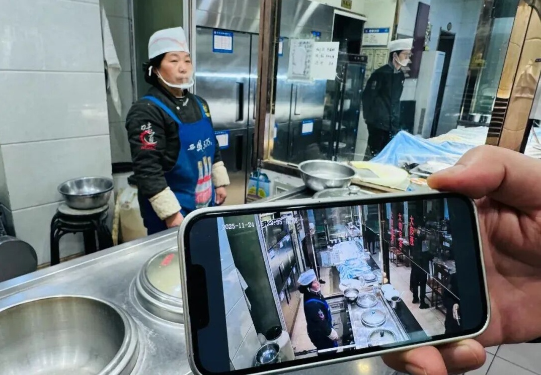 “您有新的美团外卖订单,请及时处理。”11月24日下午,三门峡市渑池县宏胜卤坊李家水饺餐饮店内,接单提示音清脆响起,店主查看小票后迅速安排厨师备餐。与此同时,正在此处组织召开“互联网+AI监管”现场会的渑池县市场监管局工作人员,通过手机APP打开该店外卖点单界面,后厨实时直播画面中,从食材拿取、烹制到装盒的每一个环节都清晰可见,后厨状况一目了然。