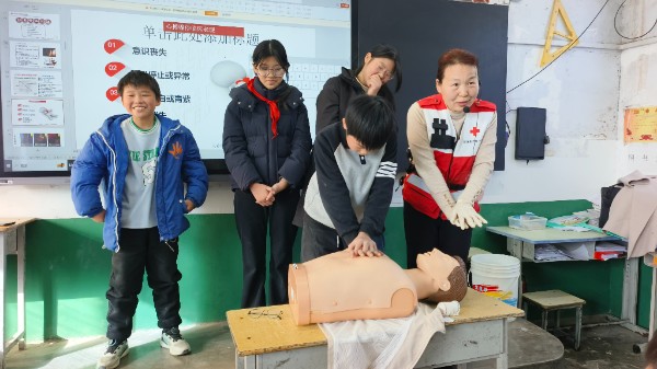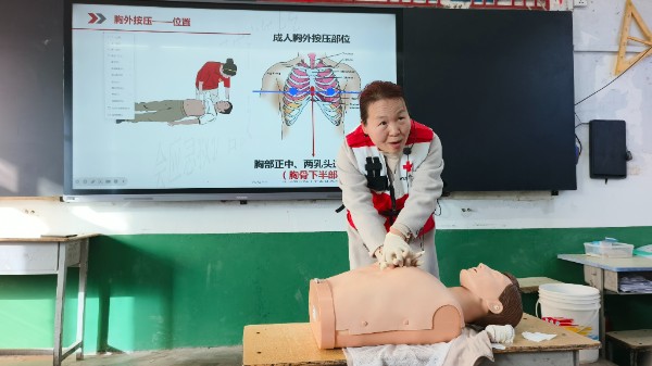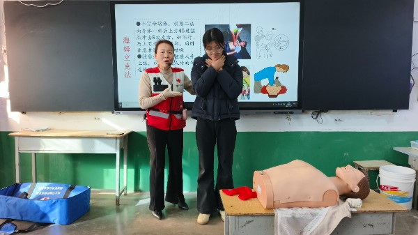 同步进行的还有应急救护培训。由驻马店市红十字会高级讲师吴春华结合乡村校园场景特点,以“生命急救,人人可为”为主题,为全体师生系统授课。培训中,吴春华重点讲解了心肺复苏(CPR)、海姆立克急救法的操作要领,同时新增AED(自动体外除颤器)操作教学模块——她从AED的基本原理、适用场景讲起,详细演示了开机、贴电极片、分析心律、按压除颤等完整流程,特别强调“在心脏骤停黄金4分钟内,CPR与AED配合使用能大幅提升抢救成功率”。针对乡村校园可能出现的异物卡喉、意外晕倒等突发情况,她用“判断-呼叫-施救”的三步法梳理急救逻辑,让师生们快速掌握核心要点。