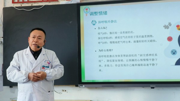 应急救护培训结束是心理分享环节,平舆县中心医院李伟的到来让孩子们充满好奇。“考试前紧张得手心冒汗?试试‘478呼吸法’,30秒就能帮你稳住情绪。”李伟边演示边讲解具体步骤:用鼻子轻轻吸气,在心里数4个数,比如“1-2-3-4”,让空气慢慢充满腹部;然后屏住呼吸,数7个数,此时可以想象自己在田野里闻花香;最后用嘴巴慢慢呼气,数8个数,把心里的“紧张气”都吐出去。除了应急的“478呼吸法”,李伟还推荐了日常可练的“腹式呼吸法”,现场有同学跟着练习后举手说:“刚才有点紧张,做完真的不慌了!”他指出,乡村青少年在成长过程中,可能会因学业挑战、亲情陪伴不足等问题产生负面情绪,若不会及时疏导,不仅影响学习状态,还可能影响身心健康,结合乡村校园的实际场景,他重点分享了两种简单易操作的呼吸调节法。