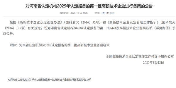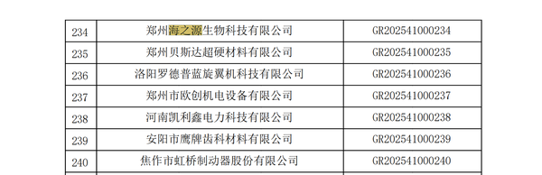 12月2日,全国高新技术企业认定管理工作领导小组办公室发布公告,对河南省认定机构2025年认定报备的第一批高新技术企业备案名单予以公示。郑州海之源生物科技有限公司(以下简称“海之源生物”)凭借持续强劲的自主研发能力、突出的技术创新成果与高效的成果转化体系,顺利通过国家高新技术企业复审认定,再次荣获这一国家级资质。