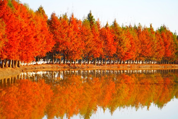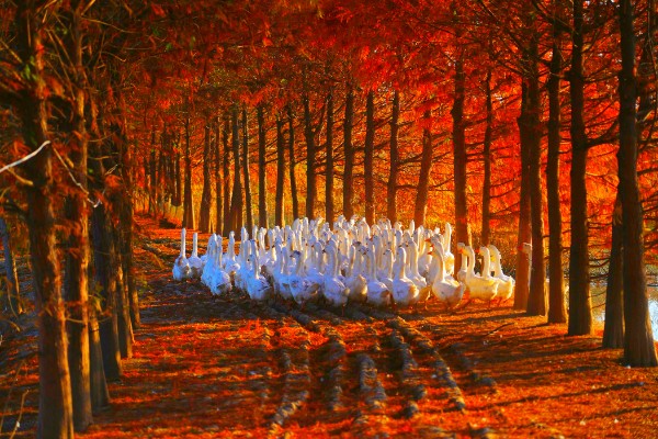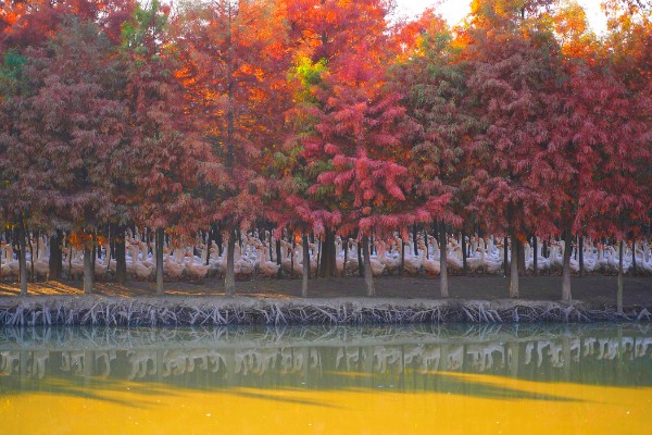 12月3日,暖阳西下,位于淮滨县苗圃场的风景这边独好。数千只白鹅嘎嘎的高声叫着在红杉林中穿行,构成了一道秀美的生态画卷。