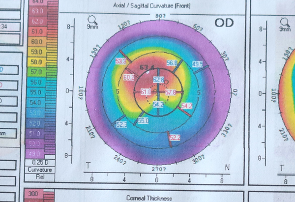 刘女士由于圆锥角膜问题,角膜曲率达到60D+(正常角膜平均曲率43D),大大超出正常值,术后视力难以预料。