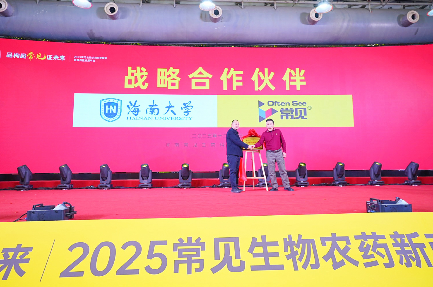 在全场嘉宾的共同见证下,常见生物与海南大学举行战略合作揭牌仪式,标志着双方将在纳米农药、绿色助剂等前沿领域开展深度合作,为企业技术创新注入更强动力。“校企携手既能让科研成果快速落地转化,也能让农户用上更先进的农资产品,这是双赢的好事!”现场经销商代表纷纷点赞。
