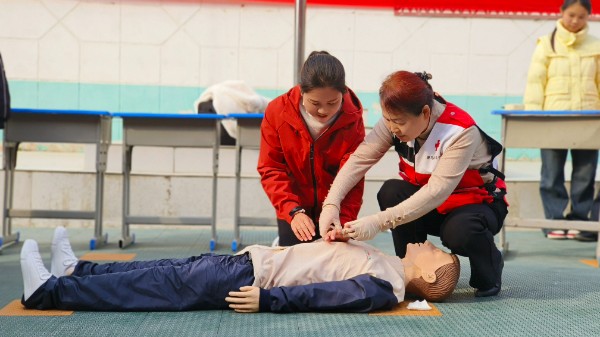 应急救护培训环节同样亮点纷呈。驻马店市红十字会高级讲师吴春华以乡村校园常见的意外场景为切入点,用生动形象的语言、鲜活真实的案例,系统讲解应急救护核心知识。培训重点聚焦心肺复苏(CPR)和海姆立克急救法,吴春华针对成人、儿童、婴儿的生理差异,结合模拟人教具,逐一演示不同场景下的急救操作手法,从意识判断、呼叫救援的前期准备,到胸外按压的位置、深度、频率,再到开放气道、人工呼吸的关键要点,每一个步骤都讲解得清晰透彻、演示得规范标准。同时,她特别强调了救人过程中的注意事项,提醒大家在实施急救前要做好自我保护,确保操作的安全性和有效性,避免因操作不当造成二次伤害。