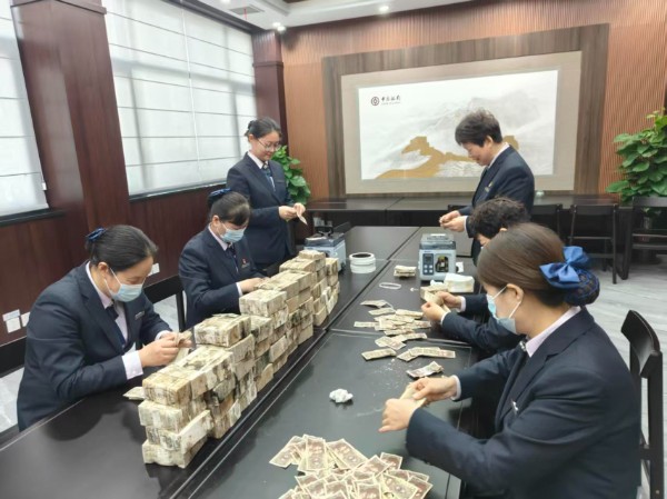 兑换当天,赵先生如约而至。营业部早已安排专人等候,开辟绿色通道,投入一整天的精力,包括午间和班后,对这批霉损纸币进行逐张拆分、清点和兑换。最终在高效而有序地处理下,五万张“水泡币”得以顺利兑换。赵先生感激不已,连声道谢:“来中国银行真是来对了!”