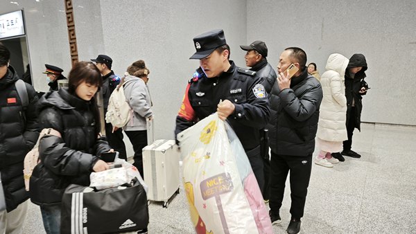 热心服务,排忧解难:民警们主动为老幼病残孕等重点旅客提供帮扶,协助提拿行李、引导乘车。面对求助旅客,耐心解答问询,安抚旅客因天气原因产生的焦虑情绪。风雪中,那一抹“警察蓝”成为旅客心中最安心的色彩。