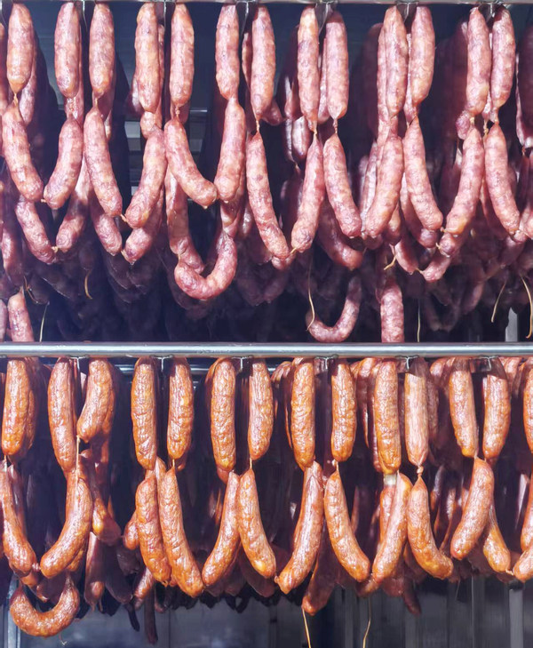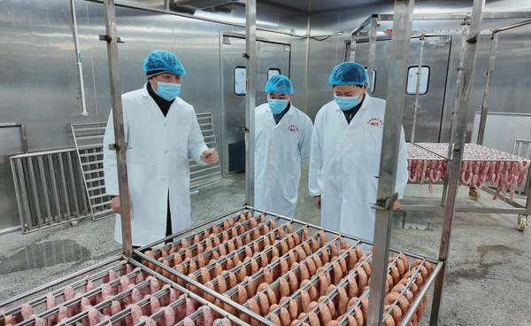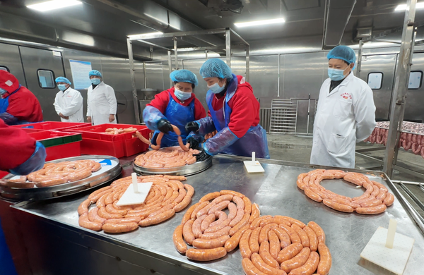 “从原料进场到成品出库,每一道工序都要守住安全底线,这是我们公司的承诺。”在李培中的引领下,赵酞翔一行先后走进该公司的消毒室、生产加工车间、恒温冷库等区域,实地探访“满食汇”鲜肉肠的生产流程。在消毒室,墙壁上贴着六步洗手法,工作人员严格执行消毒流程,规范穿戴工作服、口罩、手套等。在加工车间,自动化生产线有序运转,工人们按照标准化流程操作,上原料、清洗包衣、灌肠、排气、晾晒等环节无缝衔接。