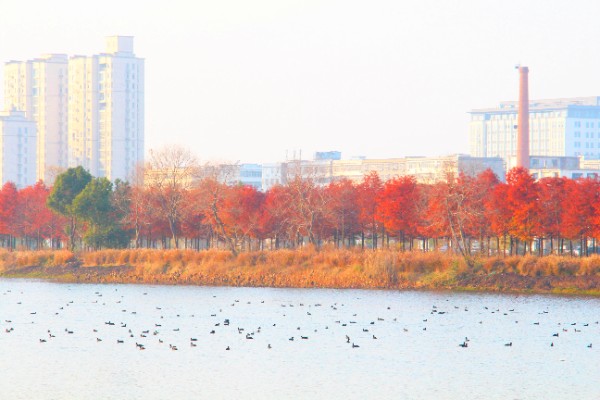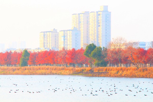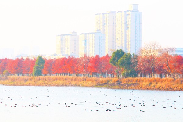 12月15日,淮滨县东湖边落羽杉红,湖畔众鸟儿湖边戏嬉,一片和谐生态场景。这杉鸟共存场面也吸引了众多居民和游人前来观赏。