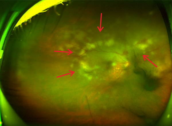 而且眼底照相也能看到视网膜水肿并乳白色混浊病灶,其内夹杂片状出血。