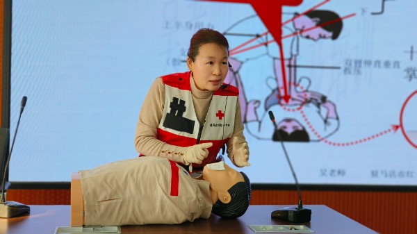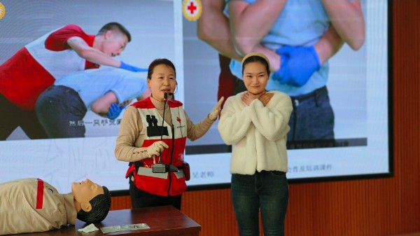 健康筛查结束后,应急救护培训成为活动的一大亮点。驻马店市红十字会高级讲师吴春华以“守护生命 学会自救”为主题,凭借丰富的教学经验和通俗易懂的语言,围绕青少年常见的应急场景,详细讲解了海姆立克急救法、心肺复苏(CPR)等核心急救技能。为让知识更易理解、技能更易掌握,吴春华讲师结合模拟人进行现场示范,从动作发力点、操作步骤到细节注意事项,逐一拆解演示,确保师生清晰掌握关键要领。