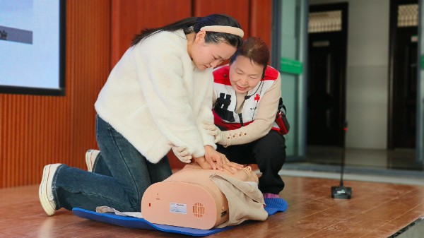 “按压时手臂要伸直,用身体重量往下压,频率保持在每分钟100-120次。”在实操互动环节,吴春华讲师手把手指导同学们进行模拟练习,及时纠正不规范动作,解答大家的疑问。同学们积极参与、认真实践,在亲身体验中深刻认识到应急救护知识的重要性,纷纷表示“学会这些技能,以后遇到紧急情况就能帮到自己和他人了”。