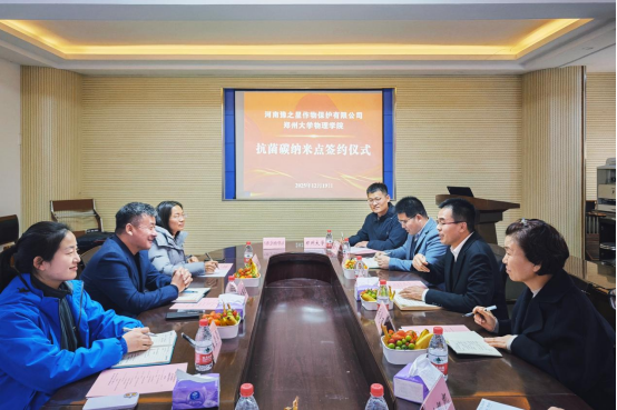 2025年12月19日下午,河南豫之星作物保护有限公司(以下简称“豫之星”)与郑州大学物理学院抗菌碳纳米点项目签约仪式在郑州大学南校区举行。郑州大学副校长单崇新、科研院副院长乔宪丽,物理学院副院长史志锋、豫之星董事长李国建及双方相关负责人出席仪式,仪式由郑州大学物理学院副院长史志锋主持。