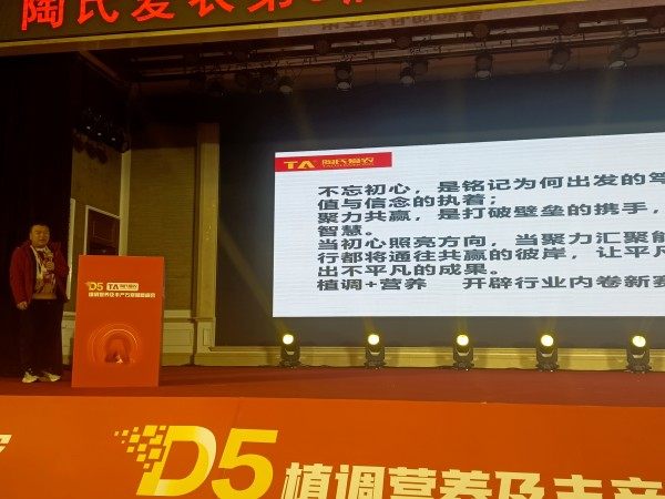 销售经理朱腾友以“植调+营养,开辟行业内卷新赛道”为题,阐述了公司如何通过产品组合与方案创新,在竞争激烈的市场中找到差异化发展路径,并再次强调了“不忘初心,聚力共赢”的企业理念。