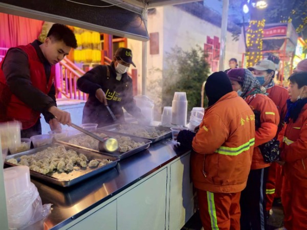 “来,张师傅,刚出锅的牛肉馅饺子,趁热吃!”在黄河南街便民疏导点,志愿者端着满满一碗饺子,递到环卫工人手中。当天上午,街道工作人员与爱心商户便在临时搭建的操作台上忙活起来。“平时凌晨4点就上工,冬至能吃上热乎饺子,还能和大家伙儿一起热闹热闹,心里别提多暖了!”环卫工人放下扫帚,坐在疏导点的休息区,三口两口吃下饺子,脸上满是笑意。活动的举办让一线劳动者“暖胃又暖心”。