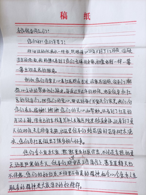 “您们非常关心社区群众的生活,谁家有困难,社区就热心主动的帮助她们解决……社区书记还用自己的车拉着老年人去医院检查身体……”这封手写感谢信,不仅是居民个人情感的真挚流露,更是社区基层治理成效的“民心答卷”。