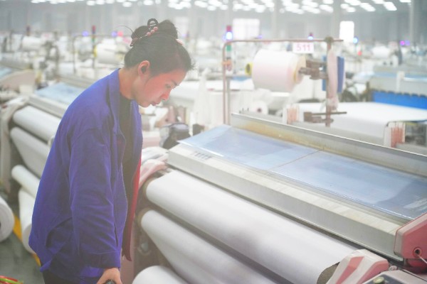 近日,在淮滨县苏阳远纺织公司生产车间内,工人们正在检查纱线生产情况,为加班加点为完成全年生产任务而努力。近年来,淮滨县在纺织产业上持续发力,目前已形成“初级丝—织布丝—成品布—印染后整理—服装深加工—市场交易”的完整产业链。