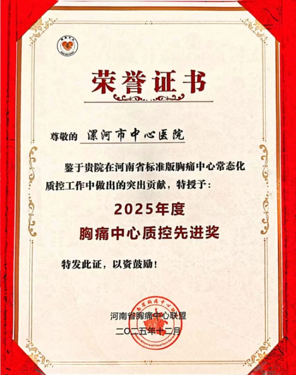 荣誉既是鼓励,更是鞭策。此次获奖,标志着医院心血管疾病救治能力与质量管理水平已迈入省内先进行列。展望未来,漯河市中心医院胸痛中心将以此为契机,持续发挥优秀单位的示范引领作用,进一步加强学科建设、深化质量控制、提升科研与教学水平,不断完善区域心血管疾病防治体系,为保障漯河及周边地区人民群众的心脏健康贡献更多力量!
