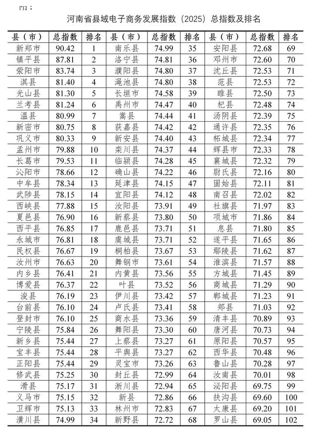 河南省作为经济大省、农业大省和人口大省,县域电商是推动乡村振兴、促进消费升级、拉动有效投资、实现产业转型的重要抓手。本次县域电商发展指数的编制,紧密对接国家乡村振兴战略部署,深度契合河南发展实际,通过科学构建评估体系、系统研判县域电商发展水平,为全省电商领域政策制定、资源精准配置、市场规范引导提供了权威数据支撑,助力形成政府引导、企业主体、社会参与的县域电商协同发展新格局。