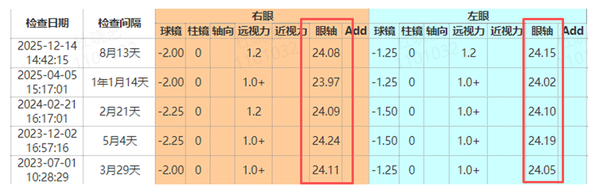 如今,寒寒已坚持佩戴离焦眼镜两年半。最新复查数据传来好消息:他的近视度数实现“零增长”,更值得欣喜的是,右眼眼轴长度从最初的24.11mm回退至24.08mm,左眼眼轴最初的24.05mm到24.15mm,虽有微量波动,但整体控制效果良好。在儿童青少年近视防控中,眼轴长度的稳定乃至回退,是比度数不增长更具积极意义的核心指标。
