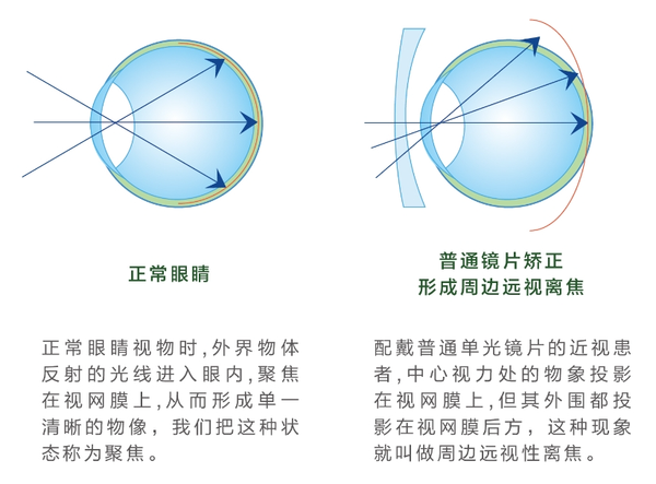 “普通单光眼镜仅能矫正中心视力,让孩子‘看得清’,但它的周边视野成像会落在视网膜后方,形成‘远视性离焦’。这种视觉信号会误导眼球,认为‘眼轴还不够长’,进而可能刺激眼轴增长,加速近视加深。”