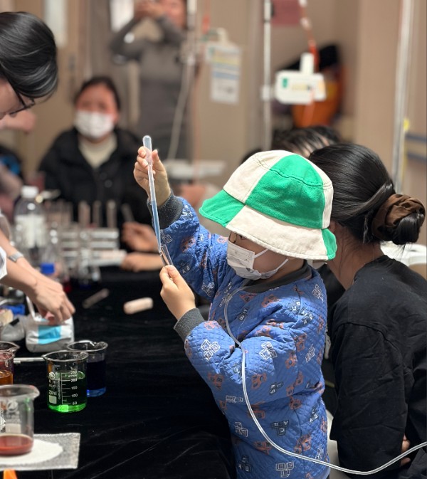 “看!颜色变了!”当两种透明液体混合瞬间变成鲜艳的红色时,孩子们睁大了眼睛。专家们一边演示“彩虹瓶”“魔法变色”等经典化学实验,一边用通俗易懂的语言解释背后的科学原理。这些平常只能在课本或视频中见到的实验,如今真实地呈现在孩子们眼前,让他们暂时忘却了病痛,沉浸在科学的奇妙世界中。