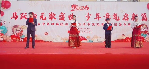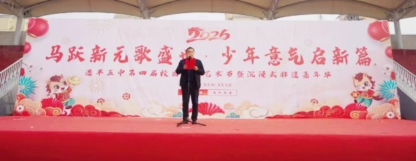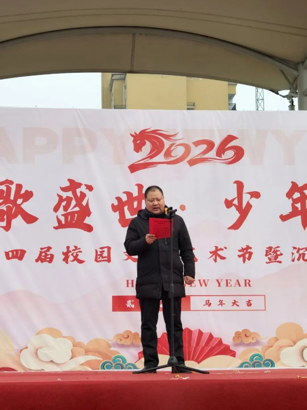 随后,王海军书记发表致辞,他向全体师生送上新年祝福,寄语同学们如骏马般奔腾向前,在知识的草原上驰骋,在文化的浸润中成长,传承非遗根脉、怀揣“马到成功”信念,勇担新时代少年使命,话语满含殷切期望,赢得全场阵阵掌声。致辞结束后,四位主持人共同宣布活动正式启动,瞬间点燃全场热情。