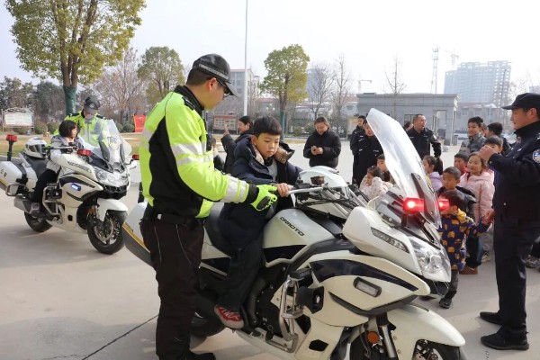 下午3时,在警察叔叔阿姨的热情引导下,警宝们排着整齐的队伍走进扶沟县公安局。刚一进门,身披藏蓝战甲、威风凛凛的扶沟交警铁骑便赫然映入眼帘,锃亮的车身、挺拔的身姿,瞬间引得孩子们发出阵阵惊叹。在交警叔叔的帮助下,孩子们小心翼翼地跨上摩托车,挺直小身板模仿着铁骑队员的标准姿势,沉浸式感受着驰骋街巷、守护平安的铁骑风采。