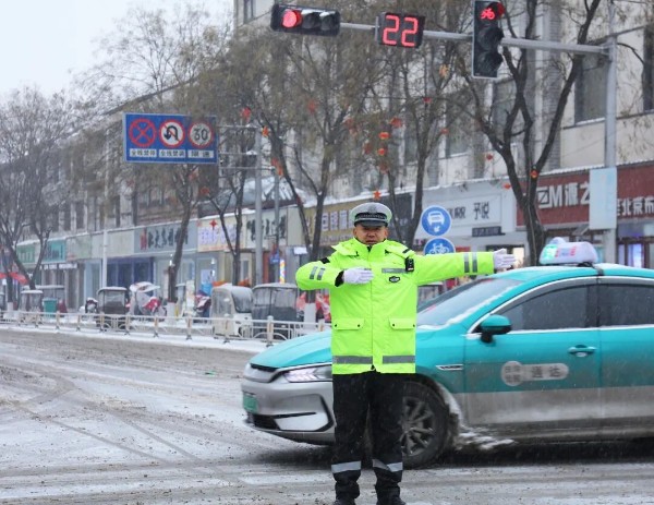 清晨的风雪中,县城各主干道、十字路口已出现执勤民辅警的身影。“路面湿滑,请保持车距、减速慢行……”交警们顶着凛冽寒风,一边用嘶哑的嗓音反复提醒过往车辆,一边挥舞手势引导交通,在积雪覆盖的路面上筑起移动“安全路标”。为打通出行通道,民辅警主动联合交通、环卫等部门开展融雪除冰作业,重点清理桥梁、坡道等易结冰路段,手持工具铲除积雪、铺设防滑物资,全力保障道路通行条件。