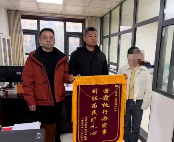 扣除预留生活费后,剩余的5.6万元执行款被及时划转至法院执行款专户。执行干警随即联系申请执行人河南某投资公司,告知其款项到账情况,并协助其快速办理款项领取手续。企业负责人在拿到执行款的同时,也送来了一面印有“雷霆执行办实事 司法为民暖人心”的锦旗,对上街区人民法院高效执行深表感谢。