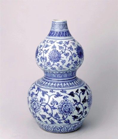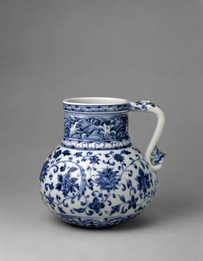 明中期以前的青花瓷器用的都是低锰高铁的苏麻离青进口青花料,所以在青花着料略重之处,往往呈现明显向下凹陷和釉面有锡银光泽结晶这两大突出特征。