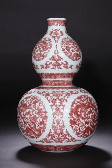 釉里红的情形与青花恰好相反,由于以铜为着色剂的釉里红对温度极为敏感,也极易流淌从而形成凸起,所以真正的明中期以前的釉里红瓷器往往都呈现出明显向上凸起和红色深浅不一有发黑、烧飞和绿苔点等突出特点,极易辨认且很难仿造。