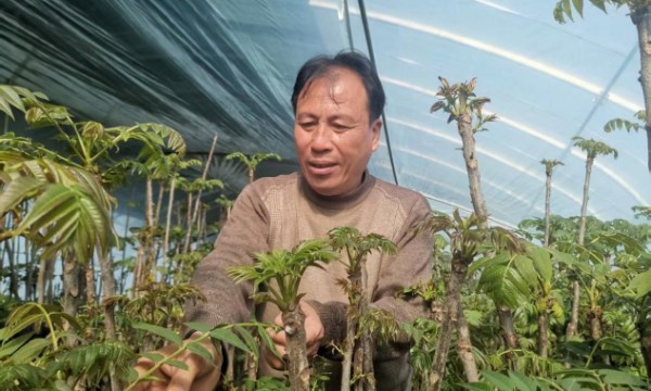 近几年,受葡萄品种和市场的影响,边岗村种植的“阳光玫瑰”价格下降,农民收益逐步减少。看到村民的“钱袋子”一天天变瘪,村“两委”班子十分的焦急。针对传统葡萄种植收益下滑,村“两委”班子主动求变,2025年从山东省潍坊市引进优质香椿苗进行试种。经数月精心管理,试种的两个大棚香椿长势喜人,新发香椿芽已达上市标准。村党支部书记王峰介绍:“当前市场价每斤70-75元,亩产超5000斤,预计每亩收益达35万元,成为村民增收的新引擎。”