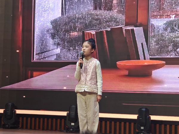 在典故互动环节,“甘棠遗爱”“崤山设伏”“杨震却金”等与三门峡紧密相关的历史典故逐一呈现,现场观众踊跃抢答,在趣味问答中重温本土历史文脉,深化对家乡的文化认同。特别值得一提的是,方留聚先生的孙女李方媛小朋友带来的《墨香里的守望》,以孩童视角讲述爷爷的笔墨情怀,展现了文化传承在血脉中的延续,打动了现场每一位观众。方留聚先生的夫人周锦华女士领衔吟诵的《七十抒怀赋》,则让大家在文字中读懂了一位文化学者的赤子之心与人生坚守。