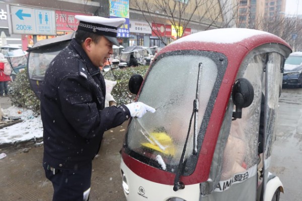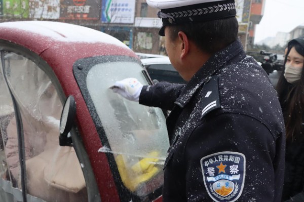 “多亏你们在,不然我们这都没办法走了。”1月19日,当市民杨小惠正望着被冻住的防风玻璃手足无措时,淮滨县交警大队副大队长张敬华立即拿出携带的身份证件为她清理。