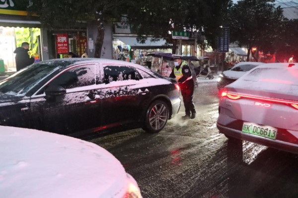 除了坚守护学一线,淮滨交警同步加大对辖区重点路段的巡逻管控力度。巡逻民警化身“推车哥”,遇到因路面湿滑被困的车辆,毫不犹豫上前合力推车;发现路面有积雪结冰隐患,及时联系相关部门协同铲冰除雪,全力恢复道路通行条件。同时,交警部门通过微信公众号、抖音等新媒体平台,实时发布路况信息、交通管制提示及雪天行车安全常识,提醒市民“降速、控距、亮尾”,科学规划出行路线,增强群众安全防范意识。