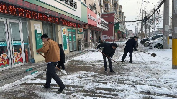 1月20日清晨,积雪已没过脚踝,运营主管李雅爽为保障网点准时开门,组织网点其他陆陆续续到岗员工和保安开始井然有序地清扫门前及台阶积雪,铺设防滑垫,设立防滑醒目警示牌为营业做准备。当天营业大厅空调全力运转,员工个个精神饱满,尽管客户量较平日有所减少,但每一位走进网点的客户都感受到了如常的专业与暖意。
