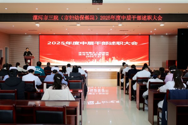为强化干部队伍建设,全面考核医院中层干部履职尽责能力和工作任务完成情况,进一步激发广大干部职工干事创业的热情、增强医院凝聚力和战斗力,谱写2026年医院高质量发展新篇章。1月21日,漯河市三院(市妇幼保健院)召开2025年度中层干部述职大会。领导班子及全体中层干部参加会议。