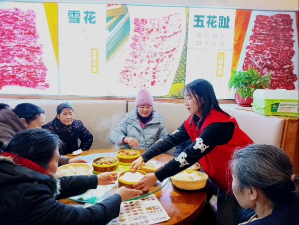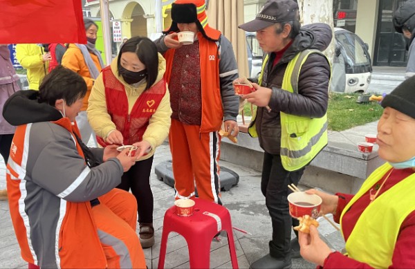 在湖东街道办事处,各社区实践站精准对接群众需求,打造“集中品粥+上门送暖”双模式。志愿者们精心熬制的腊八粥香气四溢,居民们围坐一团共品暖粥,闲话家常,其乐融融的氛围驱散了冬日寒意。同时,由志愿者组成的“送暖小队”格外忙碌,他们带着热气腾腾的腊八粥和节日祝福,登门走访高龄独居老人、物业工作人员等群体,用贴心问候和实际行动践行“我为群众办实事”实践活动的初心,让特殊群体在节日中感受到社区的关爱,切实提升了居民的获得感。