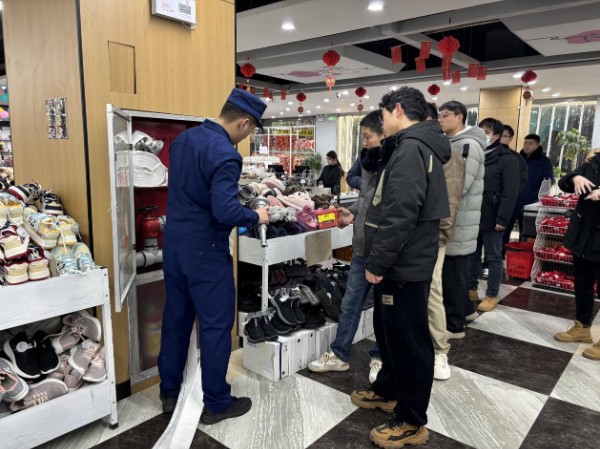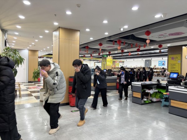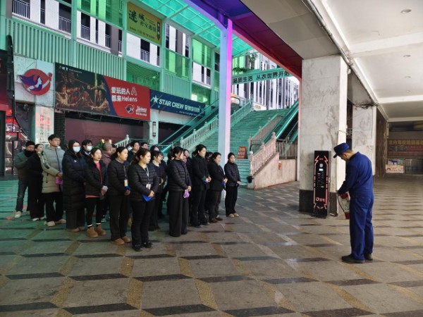 演练准备阶段,参演人员在商场门前集结完毕,现场指挥明确任务分工与安全注意事项,安全员对场地通道、消防设施进行全面检查,烟雾模拟装置、灭火器、消防水带等演练器材全部准备就绪。演练正式启动后,模拟商场内某服装摊位因电路短路引发火灾,浓烟迅速蔓延。商场员工发现火情后,立即拨打119报警并同步上报商场监控室,应急广播第一时间响起疏散通知。
