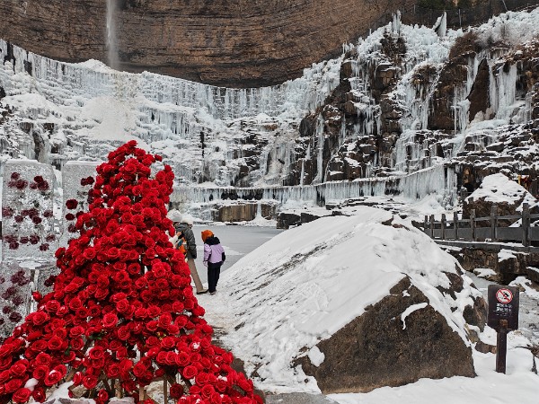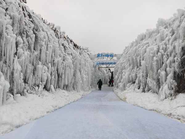 “一沟”。八里沟景区主打静美赏玩,百米冰挂在阳光下表露剔透光泽,雾凇琼枝与红石崖壁相映成趣。景区打造冰封玫瑰、水晶冰挂等特色景观,通过短视频平台推广拍摄攻略,引导游客分享美景,成功实现“流量”向“留量”转化,成为家庭游、闺蜜游优选地。