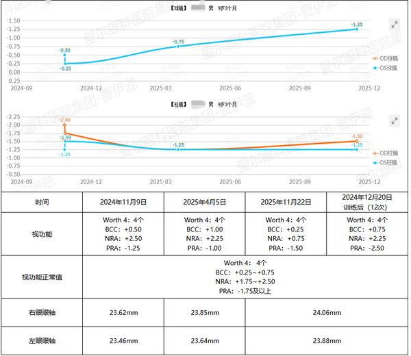 然而,由于对“视功能” 相关问题的认知尚不够深入,干预被暂时搁置了。直到2025年4月复查时,详细检查后,结果敲响了警钟——阳阳的视功能检查数据显示呈进行性下降,尤其是同视机检查发现,他双眼的集合功能远低于正常值。这意味着他的双眼在阅读时无法有效对准近处目标,容易产生疲劳。医生建议必须要进一步做近视管理:光学干预+视觉训练,以挽救不断下滑的视功能。