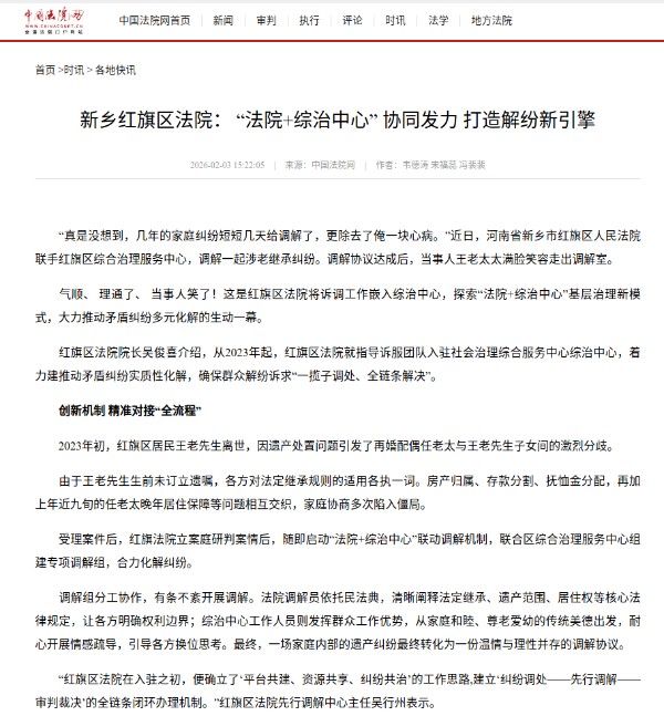 社会治安综合治理中心是立足政法职能,着眼“安全”问题,推动各部门依法履职、形成合力,开展矛盾纠纷预防化解的重要工作平台。近年来,新乡市红旗区人民法院全力支持当地综治中心运行工作,促推解纷资源整合,进一步提升矛盾纠纷预防化解法治化水平。2月3日,新乡市红旗区人民法院深度参与综治中心规范化建设工作经验在中国法院网发布。