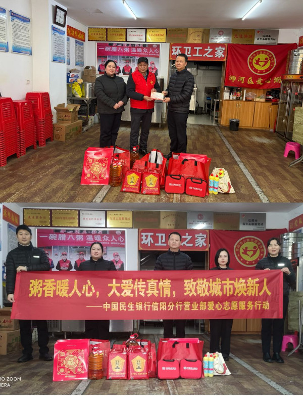 为积极践行金融企业社会责任,深度融入社区服务,传递社会正能量,积极响应社会公益号召,1月26日下午,中国民生银行信阳分行营业部程总、喻总及社区支行代表,参加信阳市浉河区爱心粥屋的定向捐赠活动。