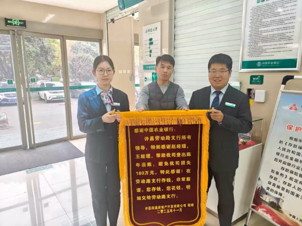 近日,农行许昌魏都劳动路支行厅堂内上演暖心一幕:许昌某房地产公司法人及儿子手持锦旗,向支行工作人员深深致谢。这场跨越17年的旧账核查行动,不仅成功化解企业法律风险,更以实际行动诠释了农行“以客户为中心”的服务真谛。